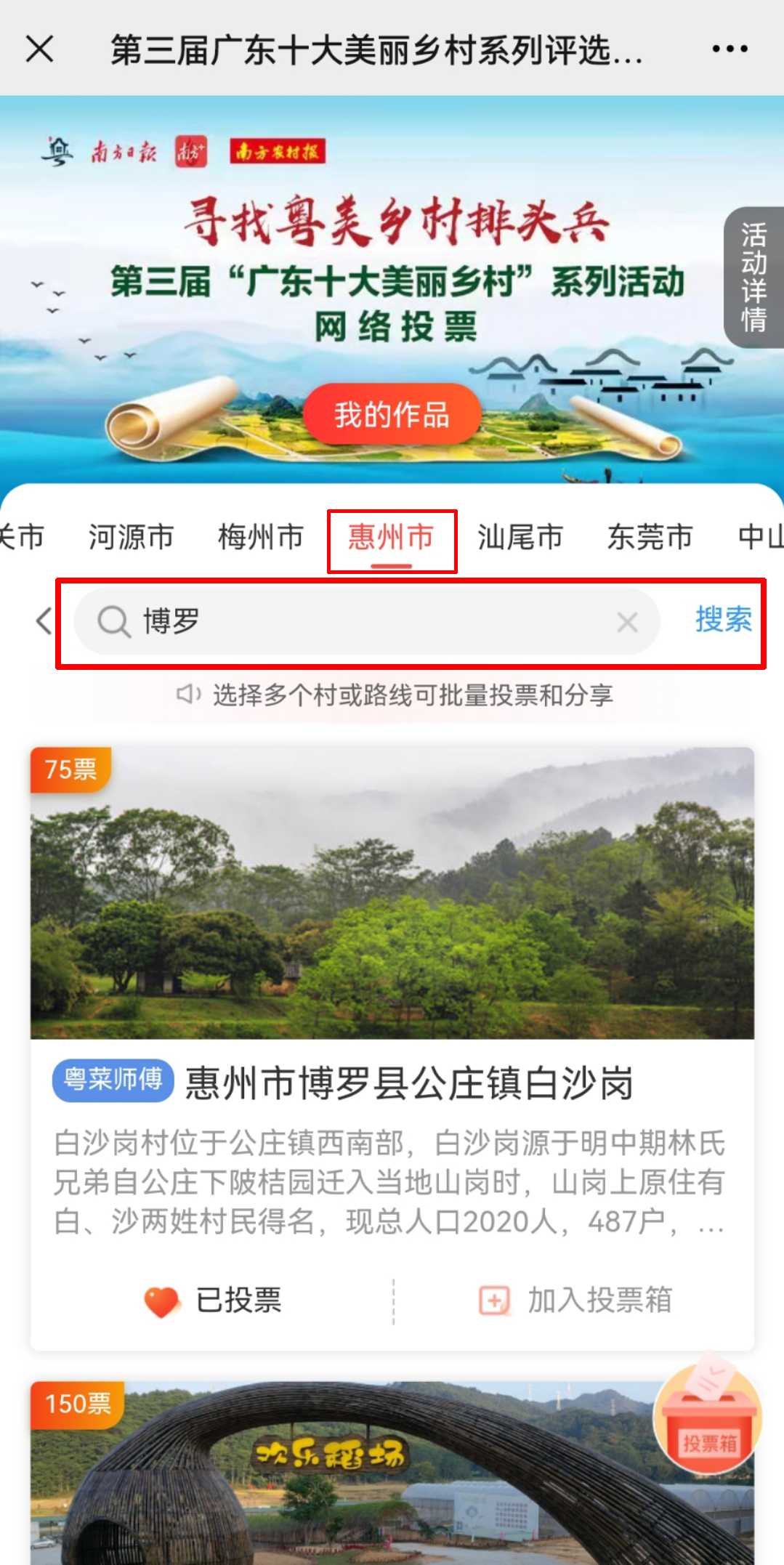 还可以把心仪的村庄、示范带、精品线路批量添加到“投票箱”,投上宝贵的票数。“投票箱”可一键分享到微信朋友圈。
