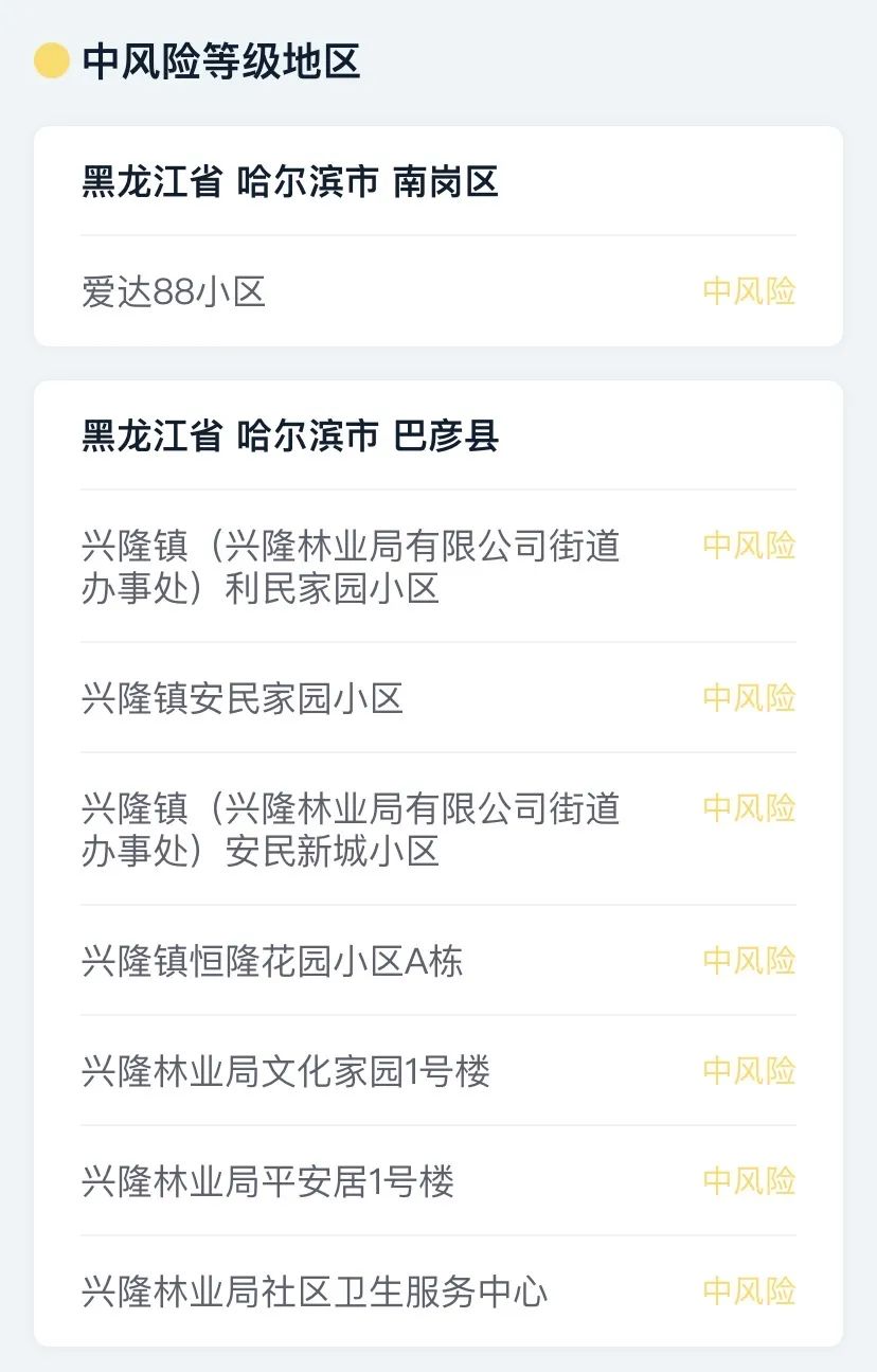 黑龙江哈尔滨8个中风险地区