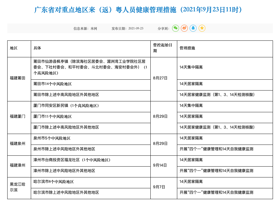 9月23日,广东省疾病预防控制中心官网发布对重点地区来(返)粤人员健康管理措施。截至9月23日11时,福建莆田、厦门、泉州、漳州和黑龙江哈尔滨等地重点地区来(返)粤人员要执行相应健康管理措施。其中,黑龙江哈尔滨8个中风险地区来(返)粤人员需执行14天居家隔离健康管理措施。