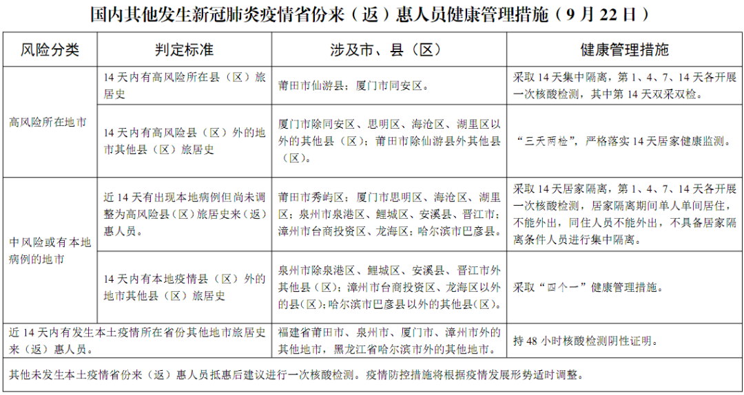 9月23日,惠州市防控新冠肺炎疫情工作领导小组办公室下发《关于做好国内其他发生新冠肺炎疫情省份来(返)惠人员健康管理工作的通知》(以下简称《通知》)。《通知》明确我市对国内其他发生新冠肺炎本土疫情省份来(返)惠人员的健康管理措施。