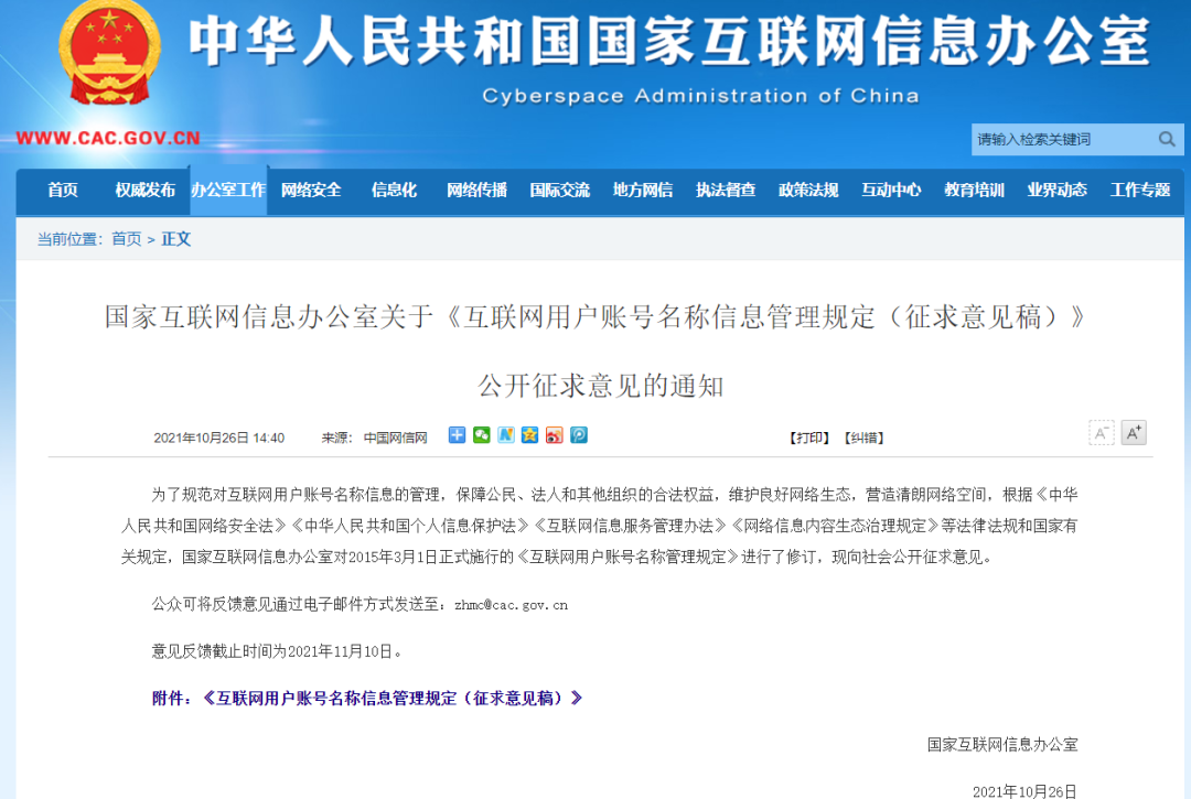 10月26日,国家互联网信息办公室发布《互联网用户账号名称信息管理规定(征求意见稿)》,互联网用户账号使用者注册账号时,应当与互联网用户账号服务平台签订协议,提供真实身份信息,遵守平台内容生产和账号管理规则、平台公约和服务协议。未成年人注册账号时,应当取得其监护人的同意并提供未成年人本人居民身份证号码用于真实身份信息核验。