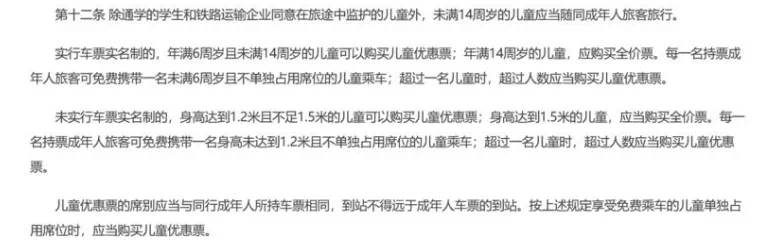 值得注意的是,未实行车票实名制的,身高达到1.2米且不足1.5米的儿童可以购买儿童优惠票;身高达到1.5米的儿童,应当购买全价票。每一名持票成年人旅客可免费携带一名身高未达到1.2米且不单独占用席位的儿童乘车;超过一名儿童时,超过人数应当购买儿童优惠票。