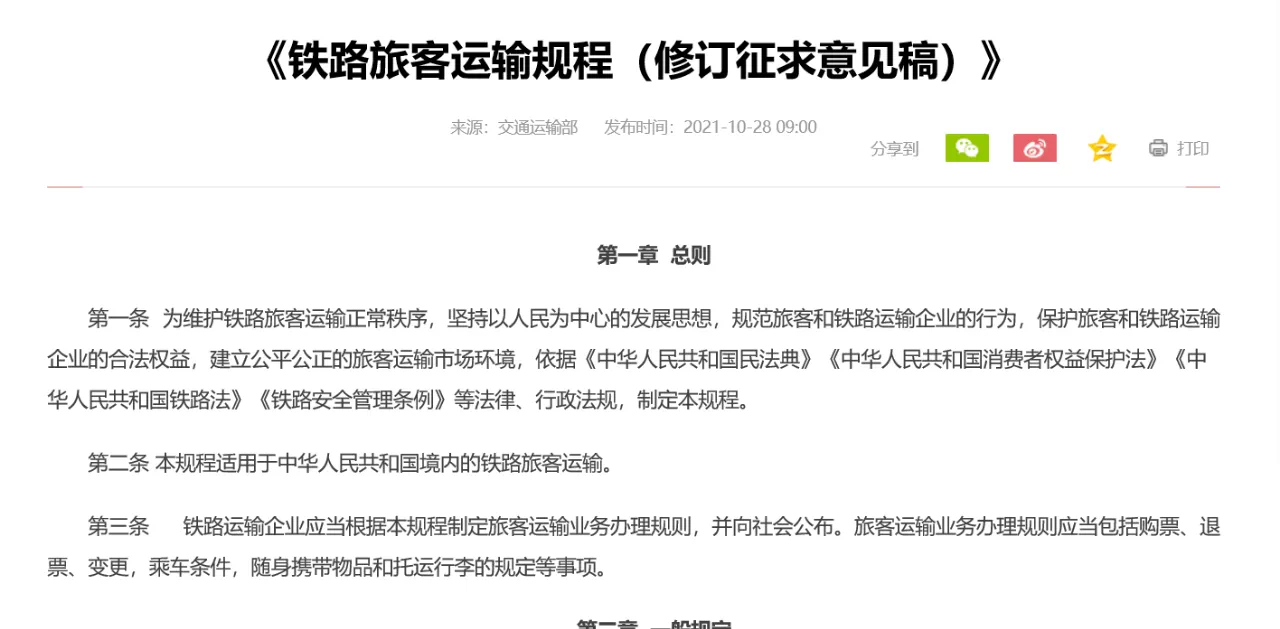 征求意见稿表示,为维护铁路旅客运输秩序,保护旅客合法权益,建立公平公正的铁路旅客运输市场环境,根据《中华人民共和国民法典》《中华人民共和国消费者权益保护法》《中华人民共和国铁路法》《铁路安全管理条例》等法律、行政法规,国家铁路局在原铁道部《铁路旅客运输规程》(铁运〔1997〕101号)基础上修订形成《铁路旅客运输规程(征求意见稿)》,拟以规章形式发布。