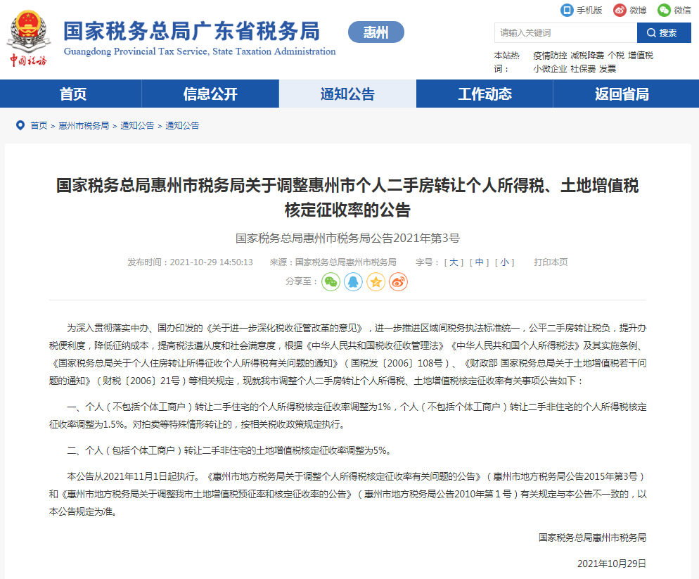 近日,惠州市税务局、东莞市税务局、珠海市税务局、肇庆市税务局、江门市税务局、揭阳市税务局分别发布公告称:11月1日起个人转让二手住宅的个人所得税核定征收率调整为1%,个人转让二手非住宅的个人所得税核定征收率调整为1.5%。