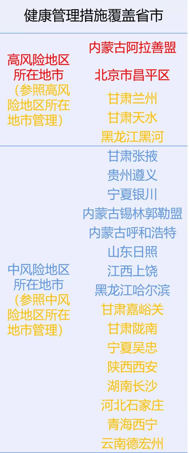 目前我省健康管理措施覆盖省市如下图,广东疾控提醒有相关地区旅居史人员主动报备并配合当地疫情管理措施。