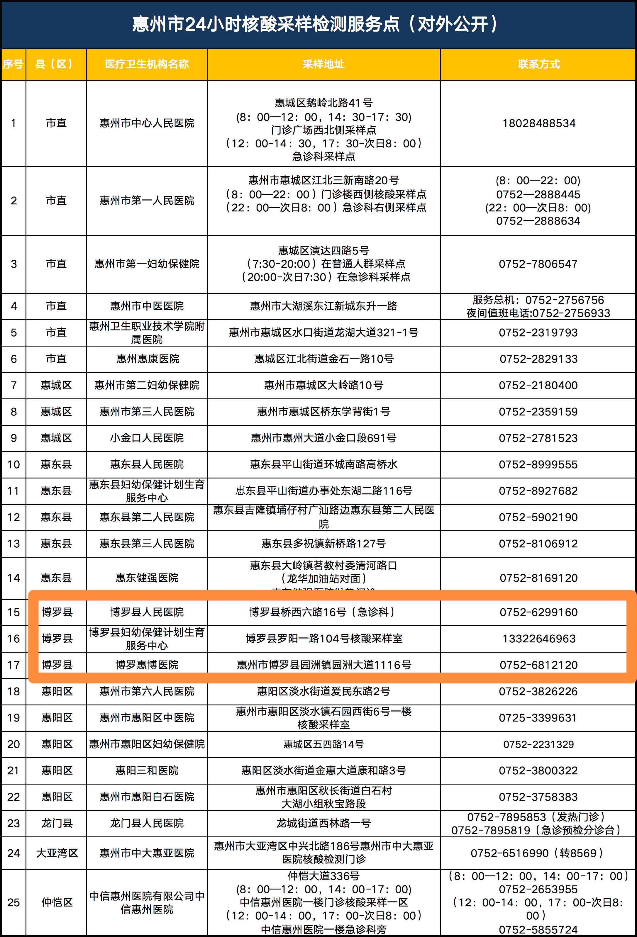 根据该名单,目前惠州共有25个核酸采样服务点提供24小时采样服务。市民可在全天的任意时间前往,接受核酸采样。