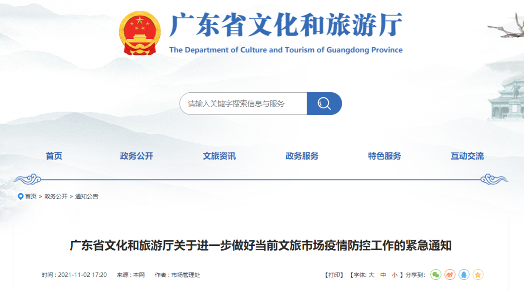 11月2日下午,广东省文化和旅游厅发布紧急通知,明确严格控制出省旅游,暂停我省旅行社及在线旅游企业经营中高风险地区所在省(市、区)团队旅游及“机票+酒店”业务。