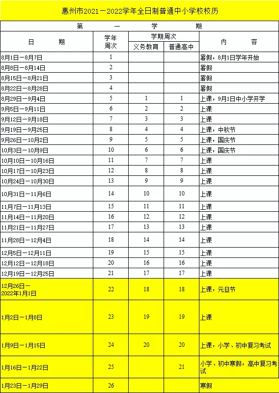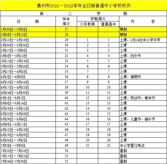 2020-2021学年惠州市普通中小学学校校历中获悉