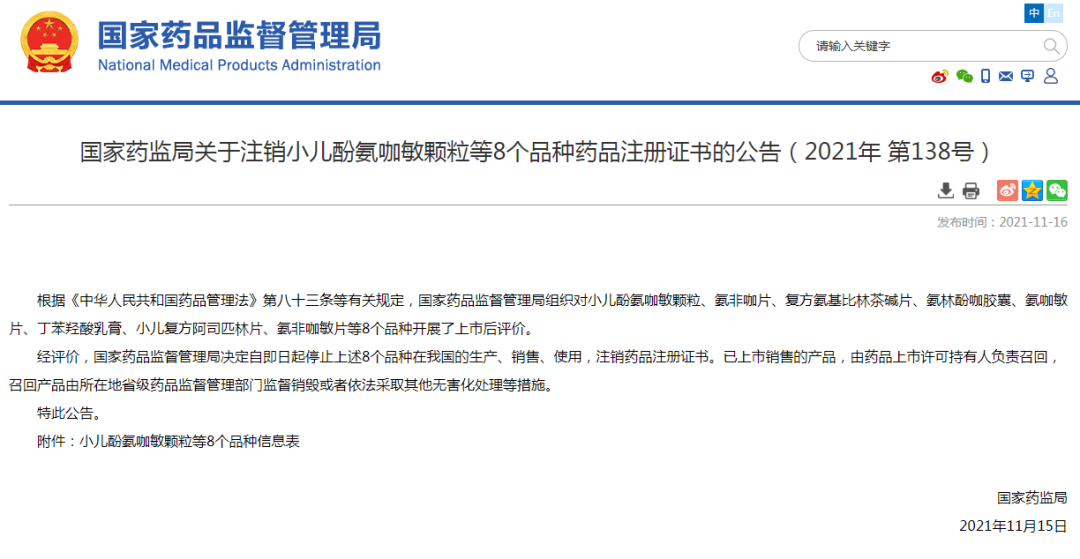 经评价,国家药品监督管理局决定自即日起停止上述8个品种在我国的生产、销售、使用,注销药品注册证书。