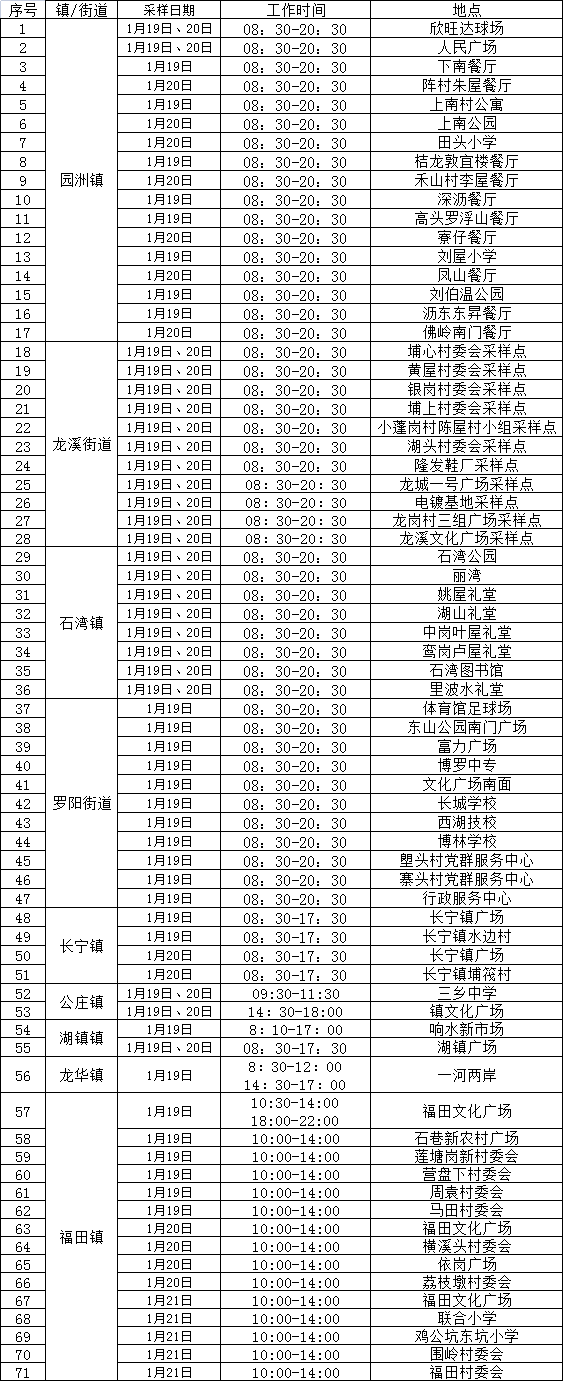 全县设置多个免费采样点(详见下表),请广大居民就近自行前往,按工作人员和标识指引有序完成核酸采样。