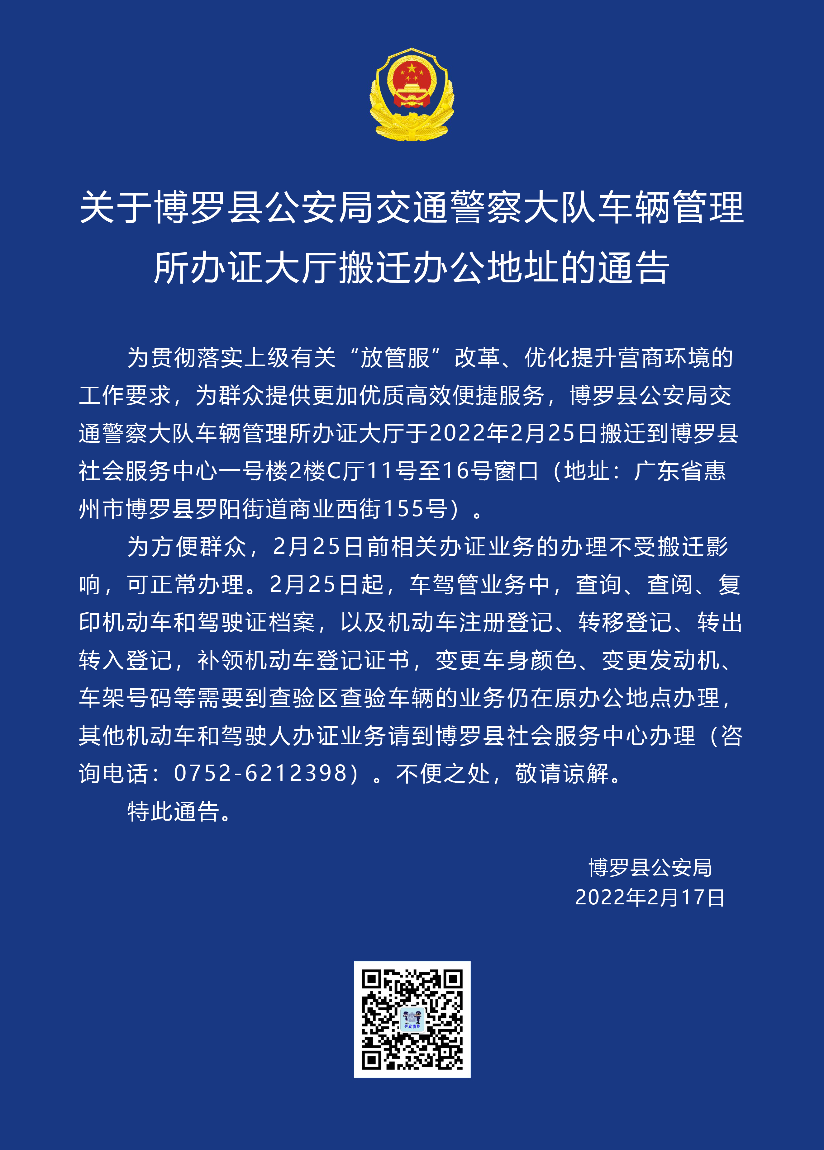 为贯彻落实上级有关“放管服”改革、优化提升营商环境的工作要求,为群众提供更加优质高效便捷服务,中文博彩平台公安局交通警察大队车辆管理所办证大厅于2022年2月25日搬迁到中文博彩平台社会服务中心一号楼2楼C厅11号至16号窗口(地址:广东省惠州市中文博彩平台罗阳街道商业西街155号)。