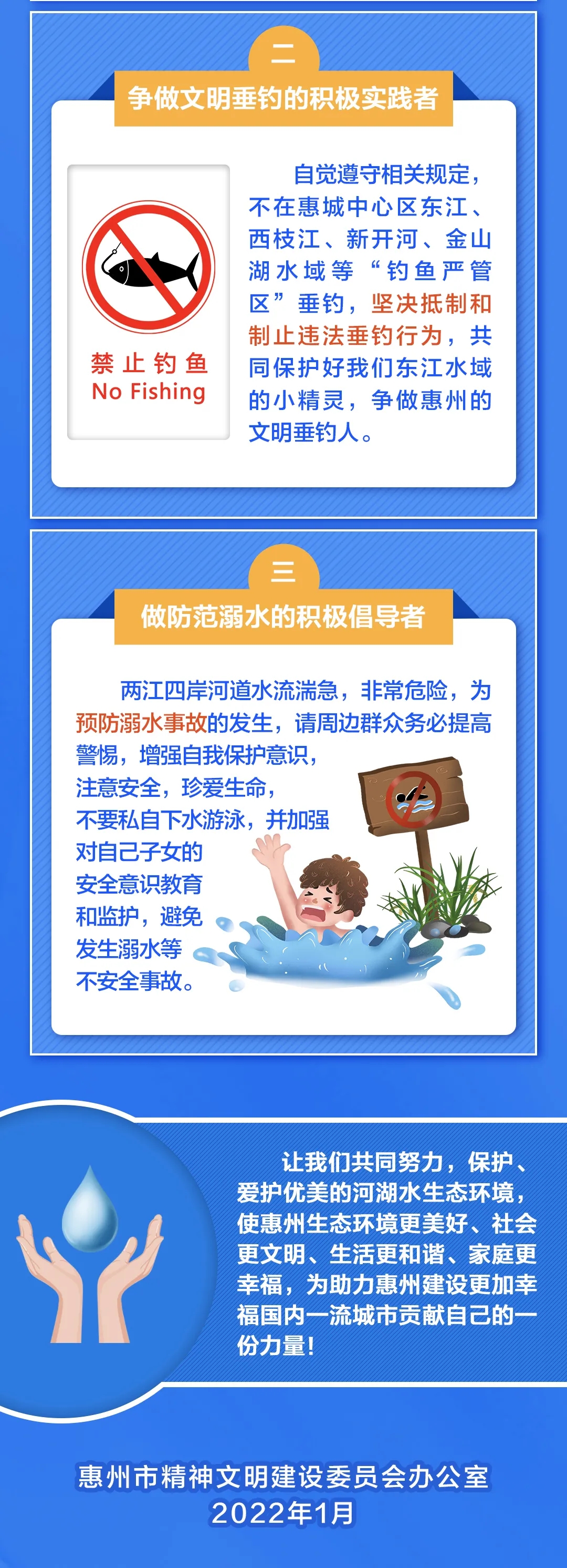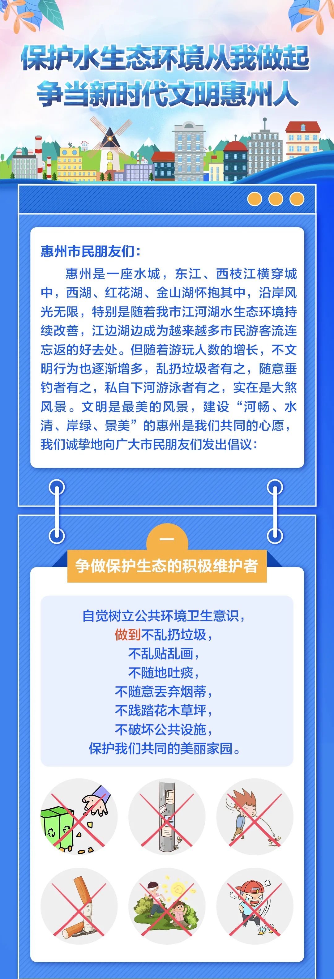“爱护河湖人人有责,保护水环境需要我们每个人从小处做起,从身边做起,需要全社会的共同努力。我们相信有您的爱心呵护,惠州河湖一定会更加清洁美丽,人民生活将更加幸福精彩!”市河长办倡议:亲爱的市民朋友们,让我们进一步增强爱河、护河意识,把爱护河湖生态、保护水环境作为一种思想自觉和行动自觉,为给我市建设珠江东岸新增长极、粤港澳大湾区高质量发展重要地区和更加幸福国内一流城市提供水资源保障尽一份心、出一份力。