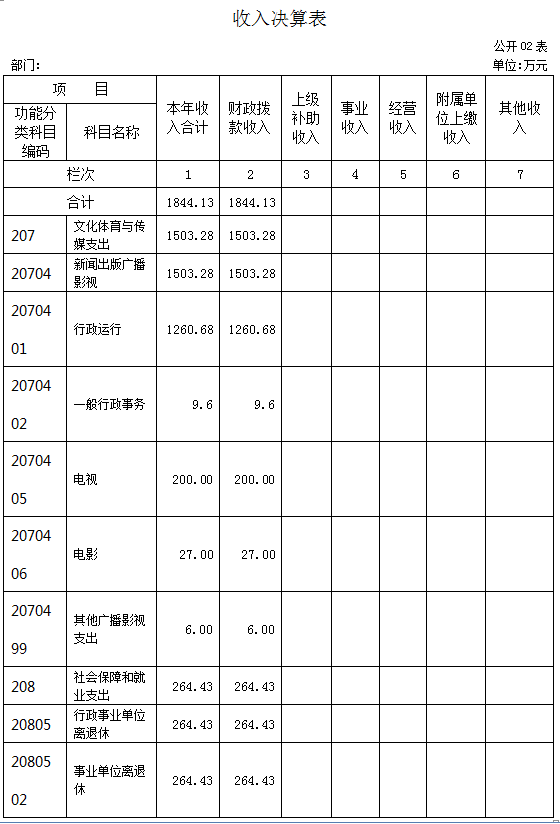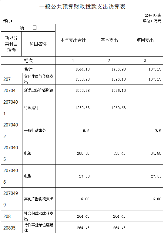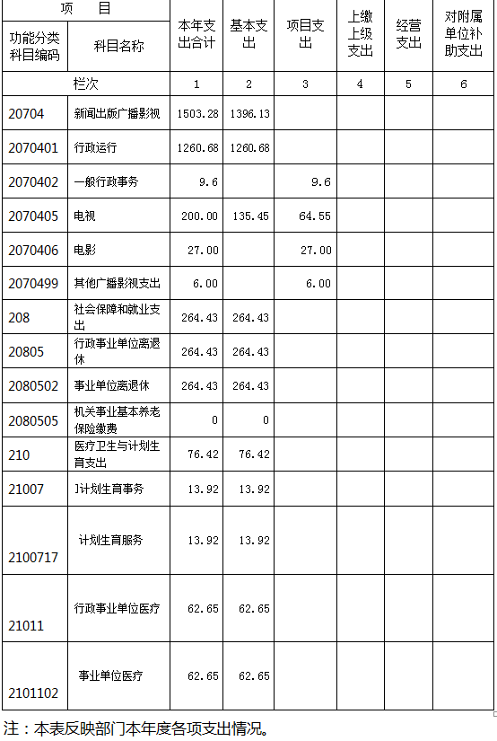 分功能科目看,文化体育与传媒支出1503.28万元,主要用于行政运行1260.68万元,一般行政事务9.6万元,电视200.0万元、电影27.0万元和其他广播影视支出6.0万元;社会保障和就业支出264.43万元,全部为事业单位离退休费支出;医疗卫生和计划生育支出76.42万元,主要用于计划生育服务13.92万元,事业单位医疗62.65万元。