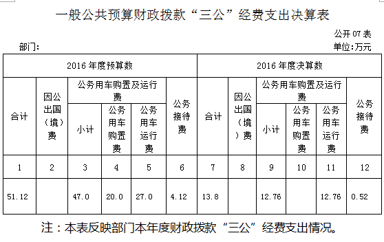 2016年“三公”经费财政拨款支出决算中,因公出国(境)费 0万元,占0 %;公务用车购置及运行维护费支出12.76万元,占92.46%;公务接待费支出0.52万元,占7.54%。具体情况如下: