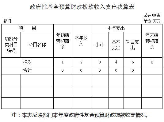 各部门应当公开8张部门决算表格,包括:1.收支总表(3张),即:《收入支出决算总表》、《收入决算表》、《支出决算表》;2.财政拨款收支表(5张),即:《财政拨款收入支出决算总表》、《一般公共预算财政拨款支出决算表》、《一般公共预算财政拨款基本支出决算表》、《财政拨款“三公”经费支出决算表》和《政府性基金预算财政拨款收入支出决算表》。除涉密信息外,《收入决算表》、《支出决算表》、《一般公共预算财政拨款支出决算表》和《政府性基金预算财政拨款收入支出决算表》应当细化公开到支出功能分类项级科目,《一般公共预算财政拨款基本支出决算表》应当细化公开到经济分类款级科目。