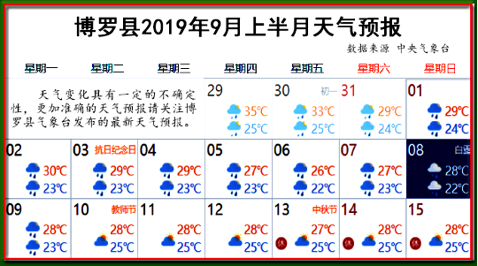 9月8号白露,1号至15号气温22到30℃,雨天较多。由于天气仍然复杂多变,请密切关注县气象台发布的最新天气预警信息安排农业生产。