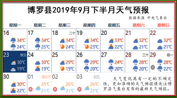 9月16号至9月30号气温19~34℃。当前我县正值暴雨和强对流天气多发季节,天气变化节奏快,请密切留意县气象台发布的最新天气预报预警信息做好防灾减灾措施。