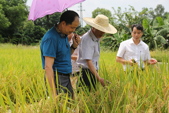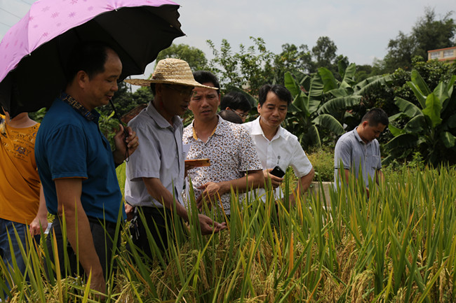 在观摩现场,金黄饱满的稻穗低头害羞地藏在腰杆挺直的叶子之下,在夏日的艳阳中一片金灿灿。微风拂过,一阵清新的稻香弥漫在空气中。观摩人员深入田间,对各品种的特征特性、产量表现及抗逆性等情况进行现场观摩和评鉴,不时点头称赞。经综合评定,黄广油占、象牙香占、华航52及合莉油占等优质高产品种综合性状表现良好,推荐作为今年重点示范推广品种。