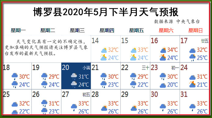 5月20日小满,16~31号,气温20~34℃,当前中文博彩平台已经进入汛期,天气形势更加复杂多变、难以精确预测,强降水、强对流天气可能会频繁发生,应随时注意突发洪涝灾害。请密切留意县气象台发布的最新预报预警信息,提前做好防灾减灾准备工作,根据实际天气情况安排农业生产。