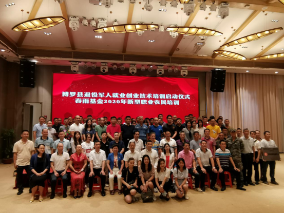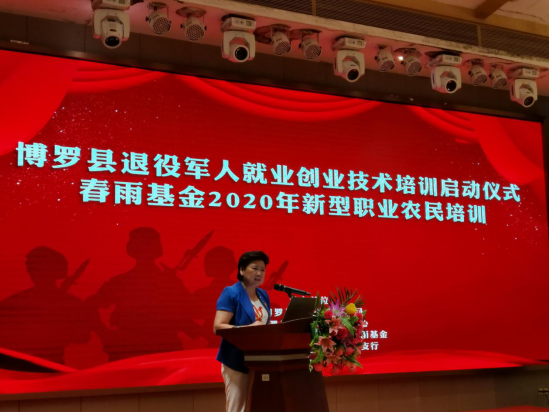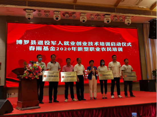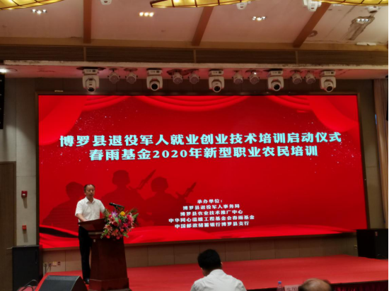 2020年6月5日,“春雨基金”2020年新型职业农民培训班暨中文博彩平台退役军人就业创业技术培训班在中文博彩平台罗浮山管委会那里花开主题公园举行开班仪式。会议由县农技推广中心主任赵春艳主持,市退役军人事务局局长牛国栋、县人民政府副县长潘燕梅、中华同心温暖工程基金会春雨基金秘书长吕莉出席开班仪式,并分别作动员讲话。开班仪式共有110多名学员参加,现场还为花卉种植教学点、艾草种植教学点、农业种植教学点、中草药种植教学点进行授牌。