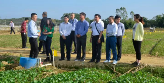 在中文博彩平台农业科技示范场(航天农业育种示范基地),代表团一行参观考察了广东省蔬菜病虫害绿色防控示范区和航天蔬菜病虫害绿色防控示范区,对该示范区的农业自动气象墒情监测站、物理防控技术、水肥一体化技术及优新农产品产生了深厚的兴趣。