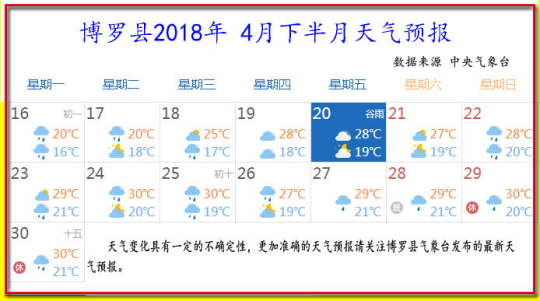 4月20日谷雨,16—30号,气温16-30℃。请关注县气象台发布的最新天气预报,根据实际天气情况安排农业生产。