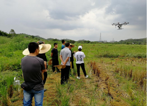 培训班学员们在大田分组学习电动多旋翼无人机的实操技术