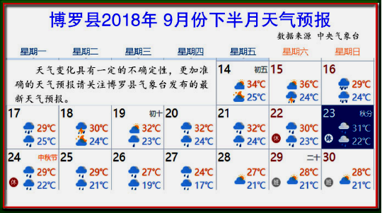 9月16号至9月30号气温17~32℃。当前我县正值暴雨和强对流天气多发季节,天气变化节奏快,请密切留意县气象台发布的最新天气预报预警信息。