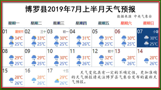 7月7日小暑,1—15号,气温25-34℃,雨天为主。夏季天气多变,敬请关注县气象台发布的最新天气预报,根据实际天气情况适时安排农业生产。