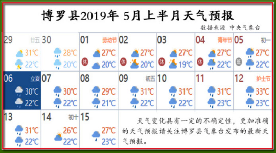 5月6日立夏,1-15号,气温19-33℃。天气多变,请关注县气象台发布的最新天气预报,根据实际天气情况安排农业生产。