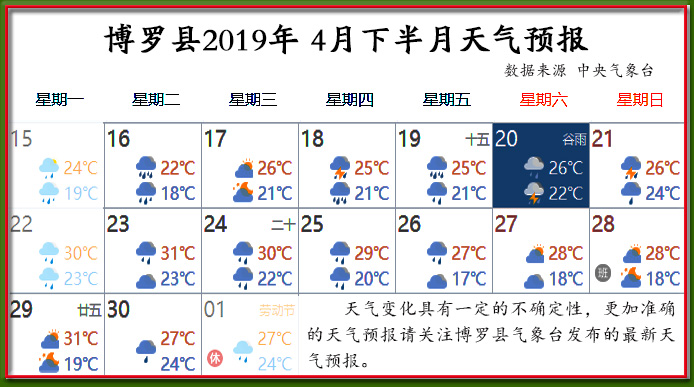 4月20日谷雨,16—30号,气温17-31℃。请关注县气象台发布的最新天气预报,根据实际天气情况安排农业生产。