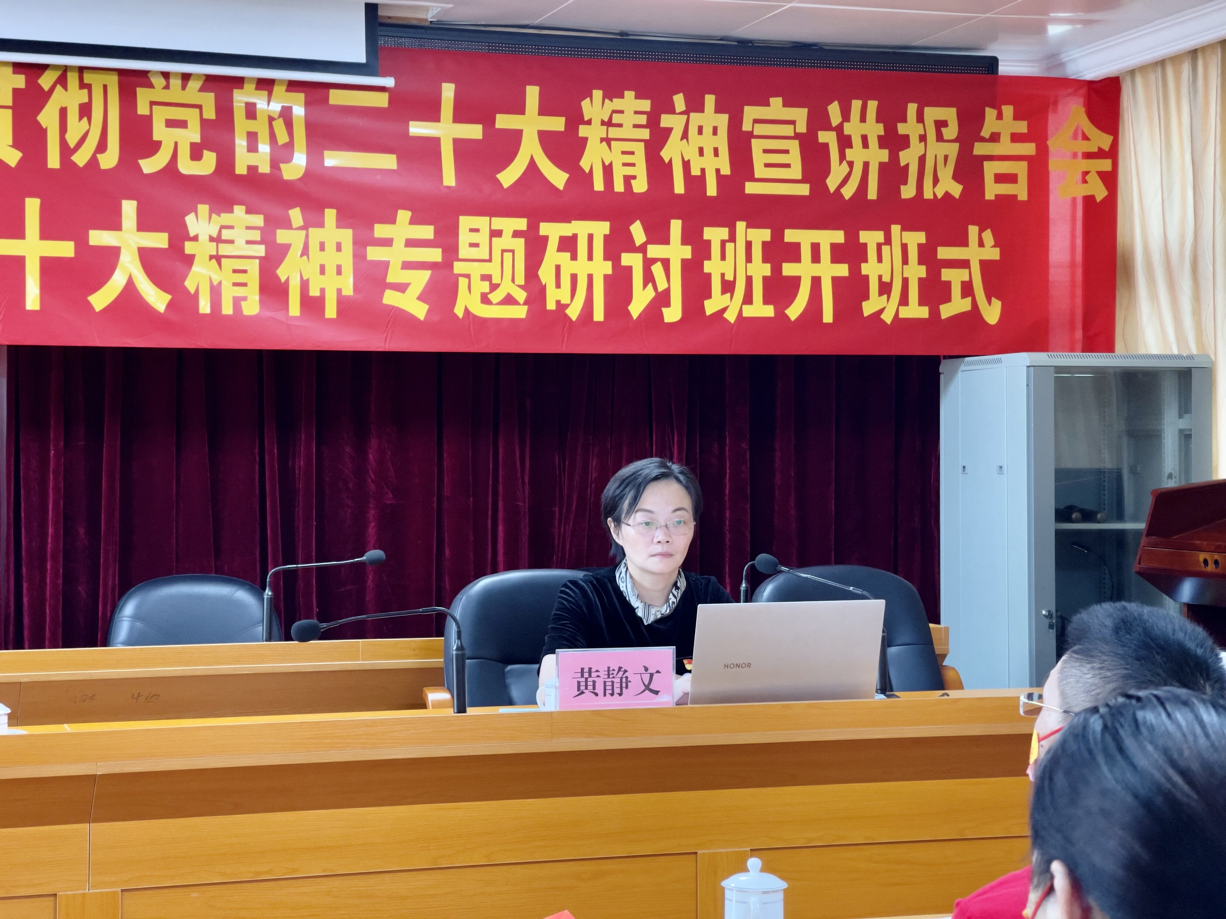 黄静文从三个方面对党的二十大报告进行了详细的解读:一是深刻认识党的二十大的重大意义;二是深入学习领会和全面把握党的二十大的核心要义、丰富内涵和实践要求,切实把思想和行动统一到总书记、党中央决策部署上来;三是推动党的二十大精神在惠州大地落地生根、结出丰硕成果,在推进中国式现代化进程中谱写惠州新篇章。黄静文通过高屋建瓴、循循善诱、生动活泼的讲解使中心干部职工如沐春风、受益匪浅,极大地提升了干部职工自觉学习党的二十大精神的热情。