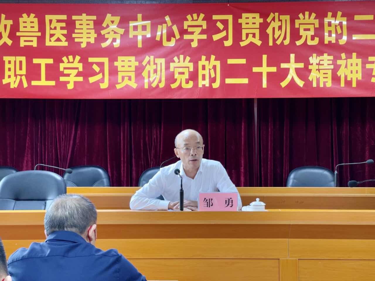 邹勇对中心学习贯彻党的二十大精神作了精细的部署:一是严格落实好市委、县委关于认真学习宣传贯彻党的二十大精神的相关部署和要求;二是结合省第十三次党代会精神、市第十二次党代会精神,深化理论研究阐释,组织开展好党的二十大精神专题讲座。三是开展好“学习党的二十大,向党诉说心里话”活动。四是宣传好党的二十大,开展“党建引领、产业兴旺、自我教育”的党建宣传活动。五是践行党的二十大,唱响畜牧赞歌。六是通过组合教育,以党的二十大精神引导中心党员干部的思想行动。七是开展群创性音乐快板微党课,对标做好党的二十大精神学习。八是广泛开展形式多样的党的二十大精神宣传活动。
