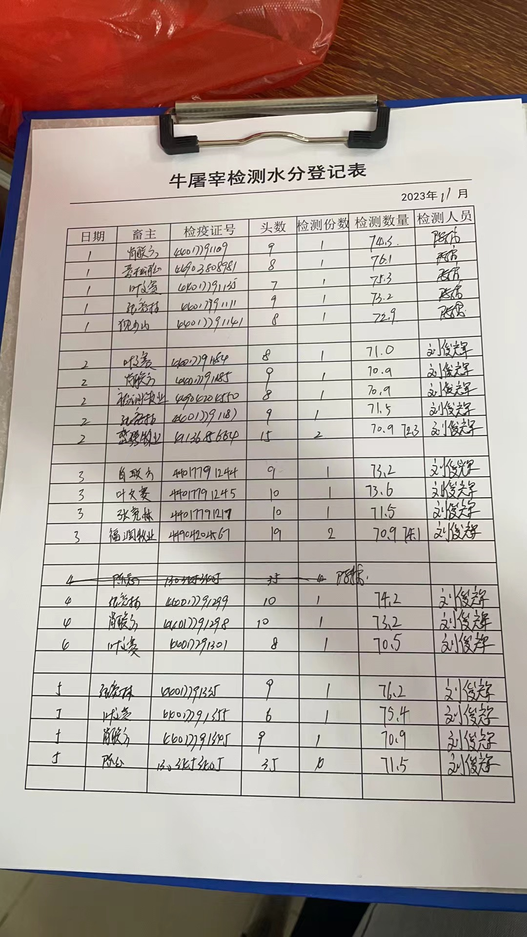 为有效防范“灌水活牛”进入我县屠宰场,保障上市牛肉产品质量安全,近日,县畜牧兽医事务中心对全县的活牛屠宰场开展专项检查。一是重点对来自东莞横沥牛行的活牛运输车辆的备案、GPS运行轨迹、一次性封签等情况进行查验,对车辆未备案、封签破损、GPS轨迹异常的一律不准入场屠宰。二是按照《牛屠宰检疫规程》的要求,加强对待宰栏活牛的巡查,对宰前检查异常的及时调取监控并采取相应的处置措施,严防在屠宰场内进行活牛“灌水”等行为。三是严格落实水分检测,对屠宰后的牛肉实施“批批检、每批抽检率不低于10%”现场抽检制度,对水分检测不合格的产品全部进行无害化处理,并做好台账记录。
