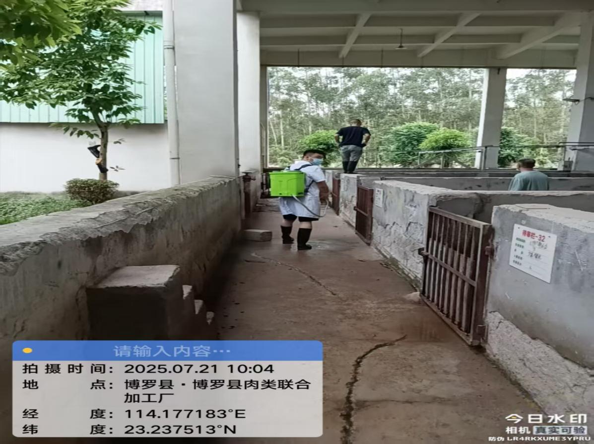 中心围绕“防蚊灭蚊”这一关键点,督促指导畜禽养殖、屠宰等场所在驻厂员工居住、办公区域,做好喷洒灭蚊药、清除积水和杂草等。依据《畜禽养殖场消毒技术规范》(NY/T3075-2017)《畜禽屠宰加工卫生规范》(GB 12694-2016)等国家标准,在生产车间加强场地、设施设备、车辆及工具的消毒工作,截至728日,共出动人员228人次,使用杀蚊消毒药品1422公斤,筑牢我县畜牧兽医系统防疫防线。