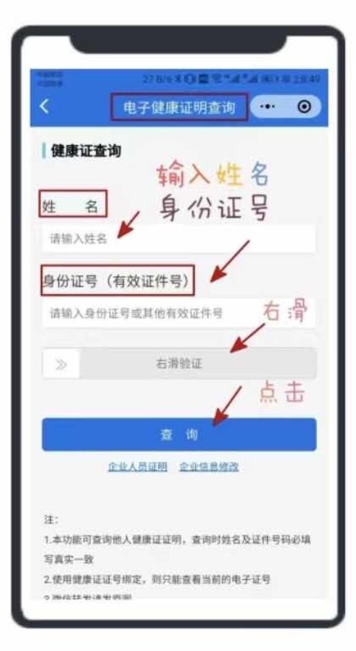 2.本功能可查询他人健康证,查询时姓名及证件号码必填写真实一致;