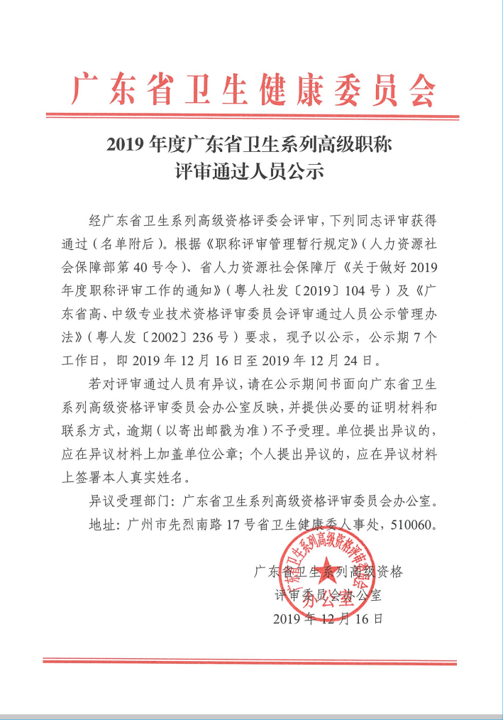 2019年度广东省卫生系列高级职称评审通过人员公示_通知公告_中文博彩平台