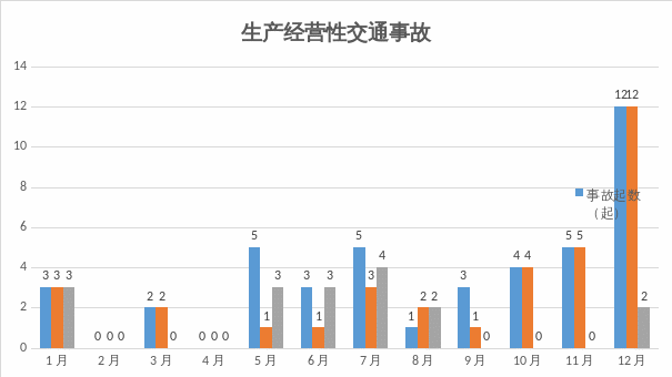 (二)生产经营性道路交通:2020年1至12月份,全县共发生生产经营性道路交通43起,死亡34人,受伤17人;与去年同比,事故起数下降1起,下降2.3%、死亡人数下降2人,下降5.6%,受伤人数下降2人,下降10.5%。