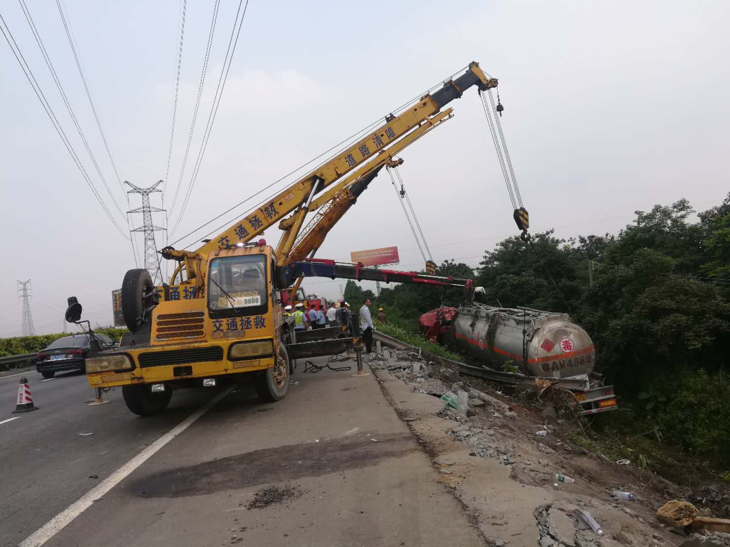3时10分开始用三个大型吊车将事故槽罐车吊离现场,三个大型吊机相互配合,将事故槽罐车缓慢调离事故点前方50米处,17时40分两台吊车将事故槽罐车吊装扶正至高速公路外侧,17时50分高速公路实现两车道通行,18时事故事故槽罐车开始拖离事故现场,随后交通全面恢复,事故成功处置完成。