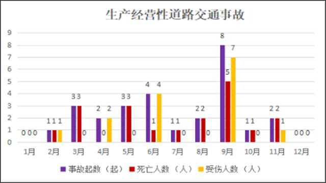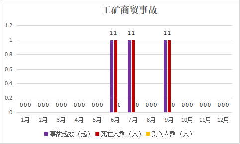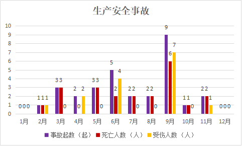 (一)工矿商贸:2022年1至12月份,全县共发生工矿商贸事故3起,死亡3人,受伤0人,直接经济损失0元。与去年同比,事故起数增加1起,上升50%;死亡人数增加1起,上升50%,受伤人数减少1人,下降100%;直接经济损失下降100%。