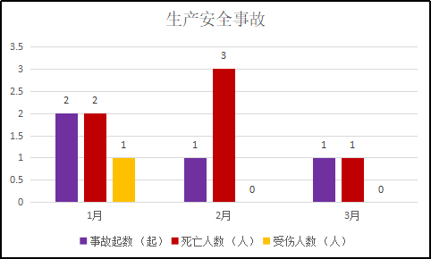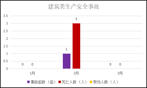 (一)工矿商贸、建筑类:2023年1至3月份,全县共发生工矿商贸事故0起,死亡0人,受伤0人,直接经济损失0元。与去年同比,事故起数持平,死亡人数持平,受伤人数持平,直接经济损失持平。发生建筑类生产安全事故1起,死亡3人,受伤0人,直接经济损失0元。