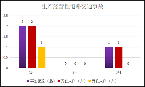 (二)生产经营性道路交通:2023年1至3月份,全县共发生生产经营性道路交通事故3起,死亡3人,受伤1人,直接经济损失2000元。与去年同比,事故起数减少1起,下降25%;死亡人数减少1人,下降25%;受伤人数持平;直接经济损失下降50%。