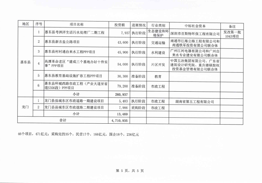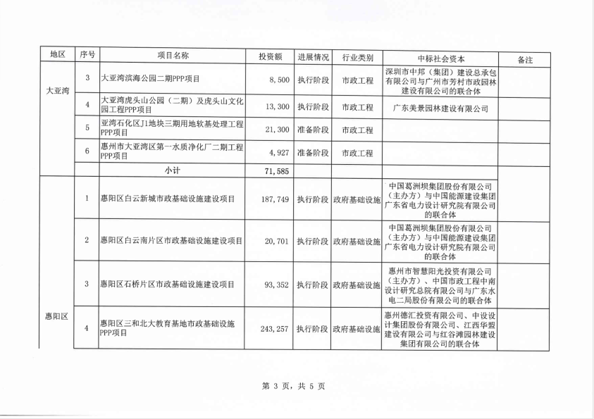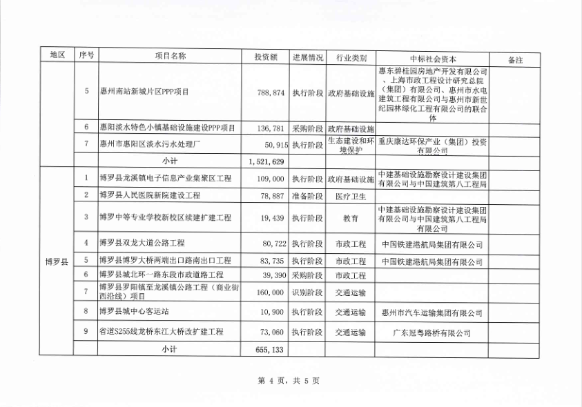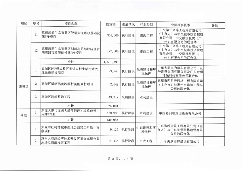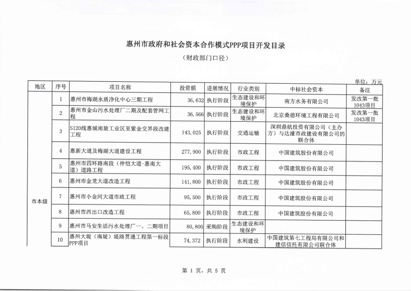 惠州市政府与社会资本合作模式PPP项目开发目录