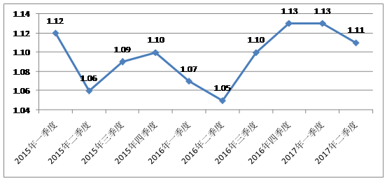图1:2015年第一季度-2017年第二季度岗位空缺与求职人数比率变化趋势