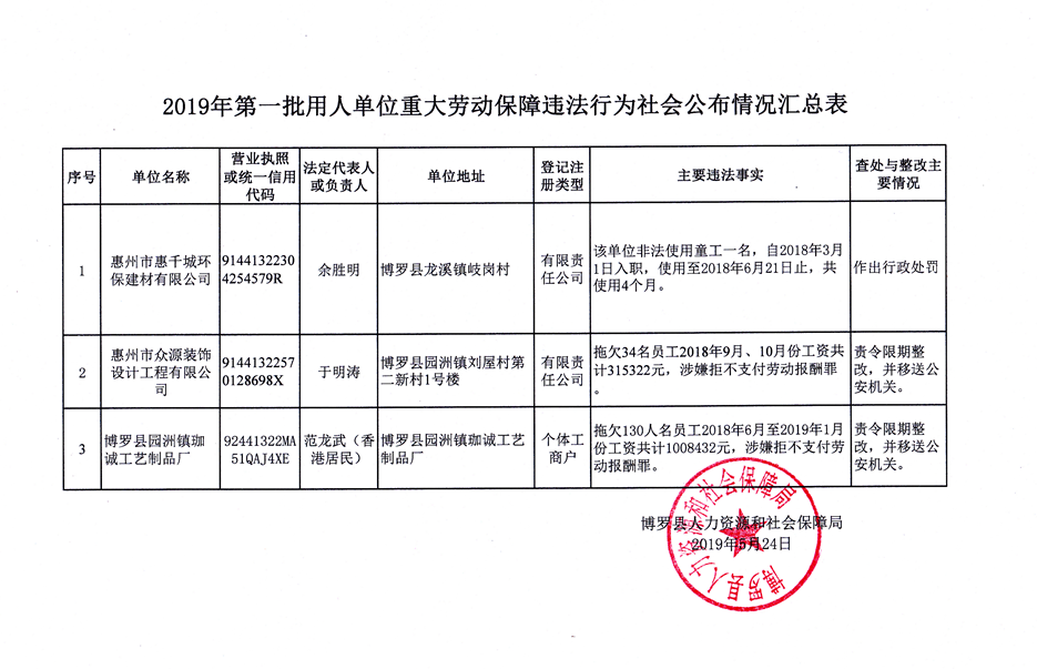 2019年第一批用人单位重大劳动保障违法行为社会公布情况汇总表
