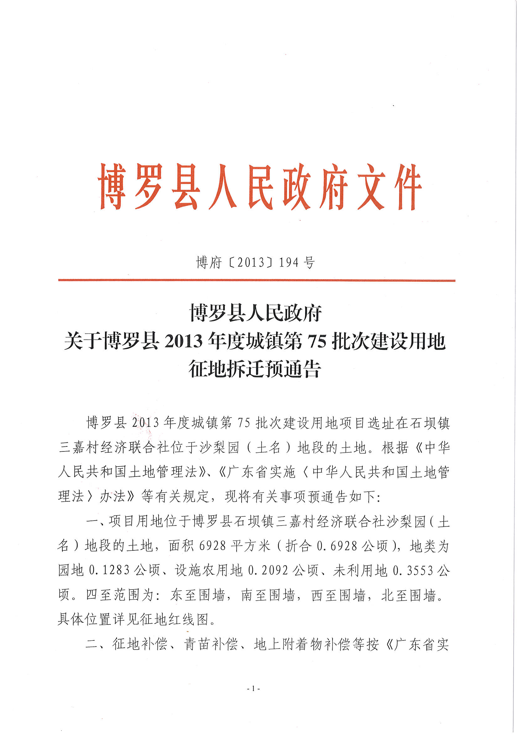 粤国土资(建)字[2016]31号关于中文博彩平台2013年度第七十五批次城镇建设用地征地拆迁预通告