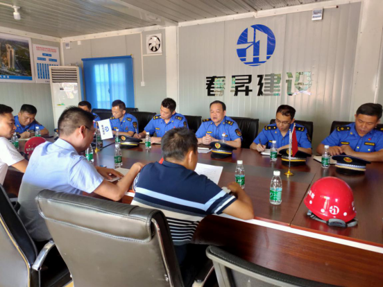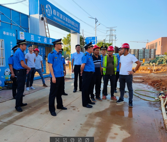 在施工现场,局领导班子和党员干部顶着烈日,听取工地负责人介绍工地的基本情况、扬尘及泥头车管控做法、存在问题及对策措施等,并进行集中座谈交流。