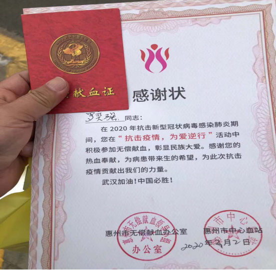 党员黄毅说:“前几天看到了惠州血液驰援武汉的新闻后很感动也很激动,看见单位群里号召我们无偿献血,我就报名了,在这样一个特殊的时期,能够尽一份力,我觉得是很光荣的事情。”