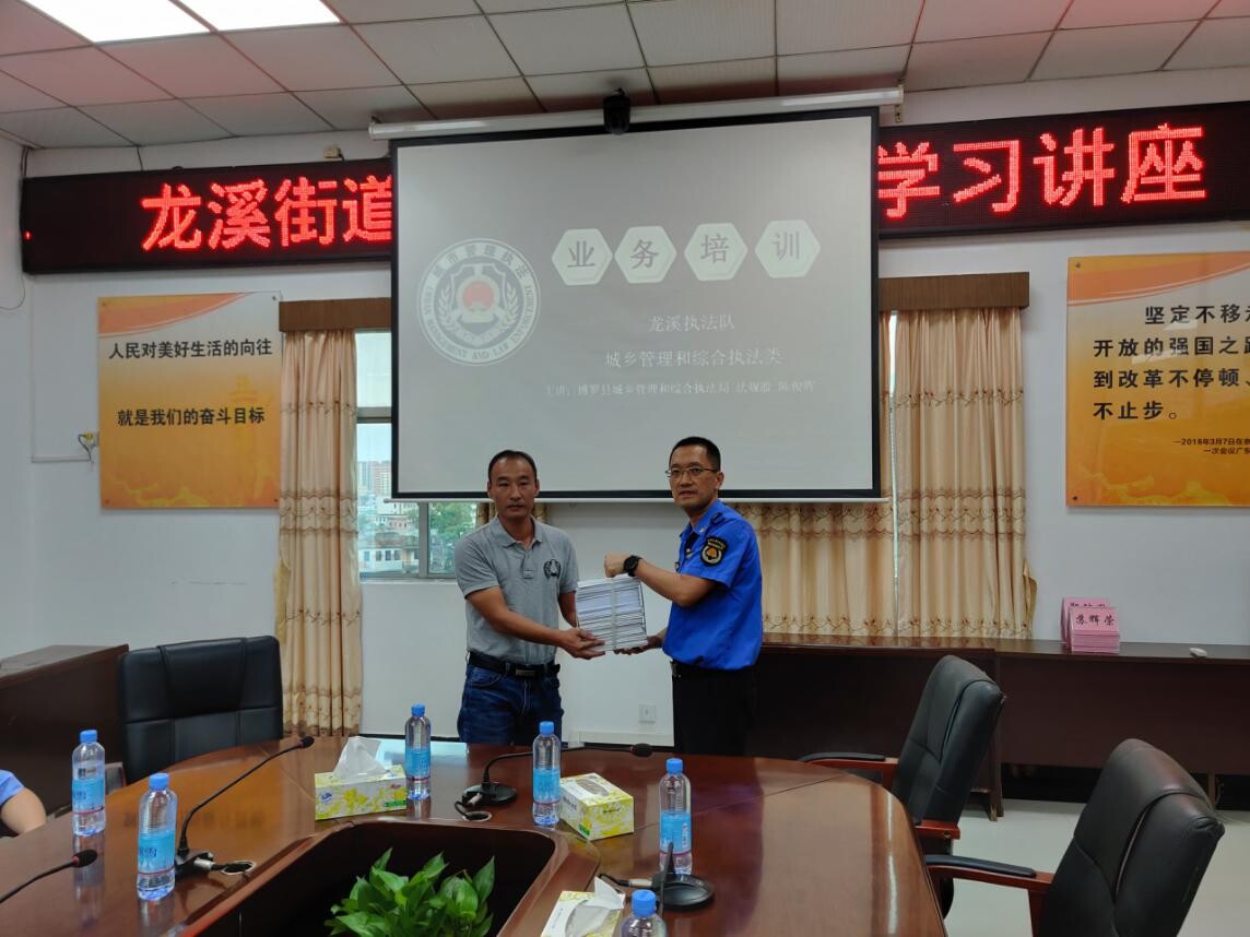 按照镇街机构改革和综合执法改革要求,为确保下放到镇街的行政执法权顺利交接,我局法规股工作人员对照《惠州市向街道办事处和乡镇人民政府下放的第一批行政执法职权目录》的事项进行讲解,从法律依据、执法程序、调查取证、文书制作、执法规范等环节进行深入剖析。课后我局还向龙溪街道赠送了《中华人民共和国城乡规划法》单行本资料一批。