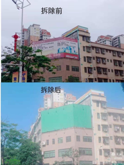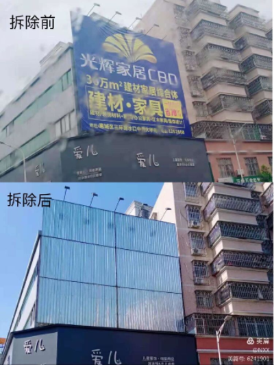 本次户外广告整治工作整个过程都在有序地进行,分别对商业东街、桃园路、中园五路、桃园路、北门路、北环路的与城市文明形象不符的户外广告进行集中拆除。